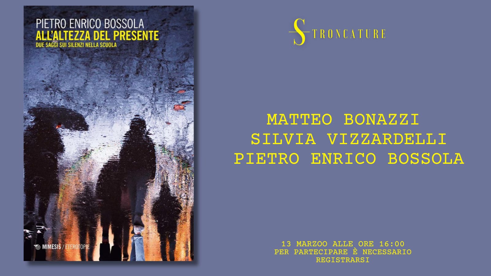 Il prossimo 13 marzo alle 16:00, Stroncature ospiterà la presentazione del libro “All’altezza del presente. Due saggi sui silenzi nella scuola” di Pietro Enrico Bossola (Mimesi, 2025).