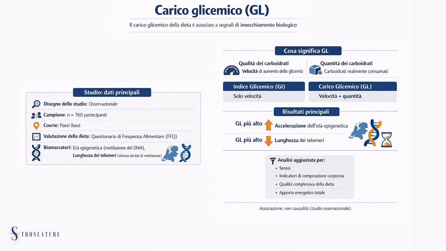 In parole povere, il carico glicemico stima con quanta facilità una dieta o un pasto favoriscono picchi di zuccheri nel sangue. Un carico glicemico della dieta elevato indica che è più probabile avere aumenti rapidi e marcati della glicemia seguendo quel regime alimentare, mentre un carico glicemico basso suggerisce un impatto più graduale e controllato. Nel paper questo parametro è stato calcolato a partire dall’assunzione giornaliera complessiva di una serie di alimenti e usato come “lente” per osservare se, a parità di altri fattori, certe diete tendono ad accompagnarsi a profili biologici che appaiono più o meno “invecchiati” rispetto all’età anagrafica.