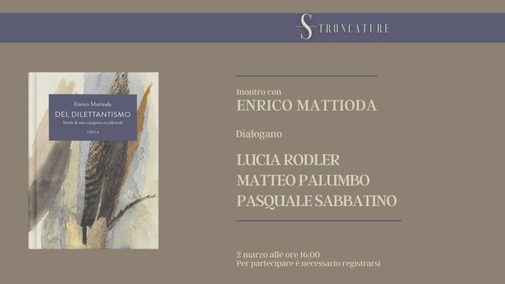 Il prossimo 2 marzo alle 16:00, Stroncature ospiterà la presentazione del libro “Del dilettantismo. Storia di una categoria occidentale” di Enrico Mattioda (Viella, 2025).