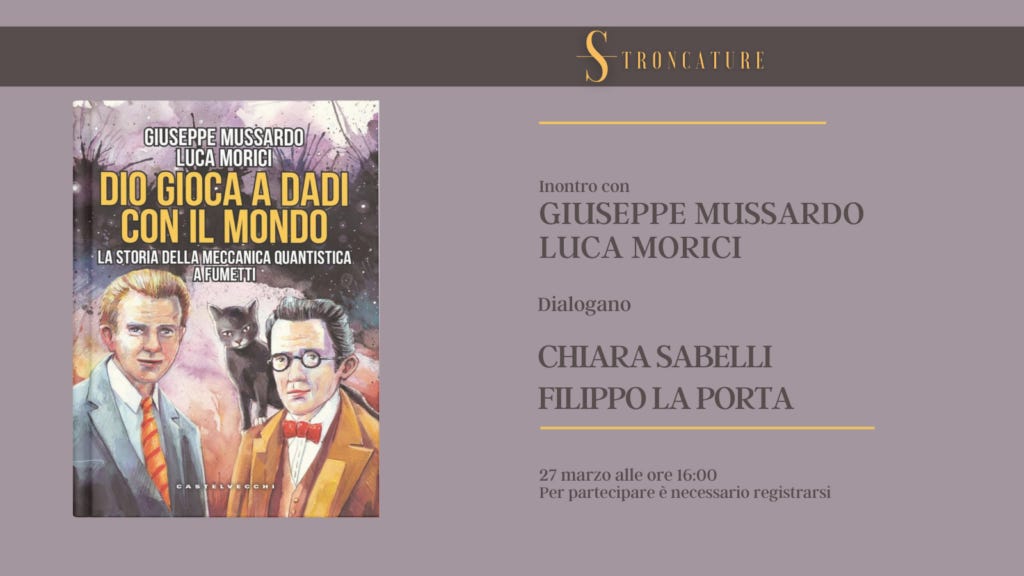Il prossimo 27 marzo alle 16:00, Stroncature ospiterà la presentazione del libro “Dio gioca a dadi con il mondo. La storia della meccanica quantistica a fumetti” di Giuseppe Mussardo e Luca Morici (Castelvecchi, 2025).