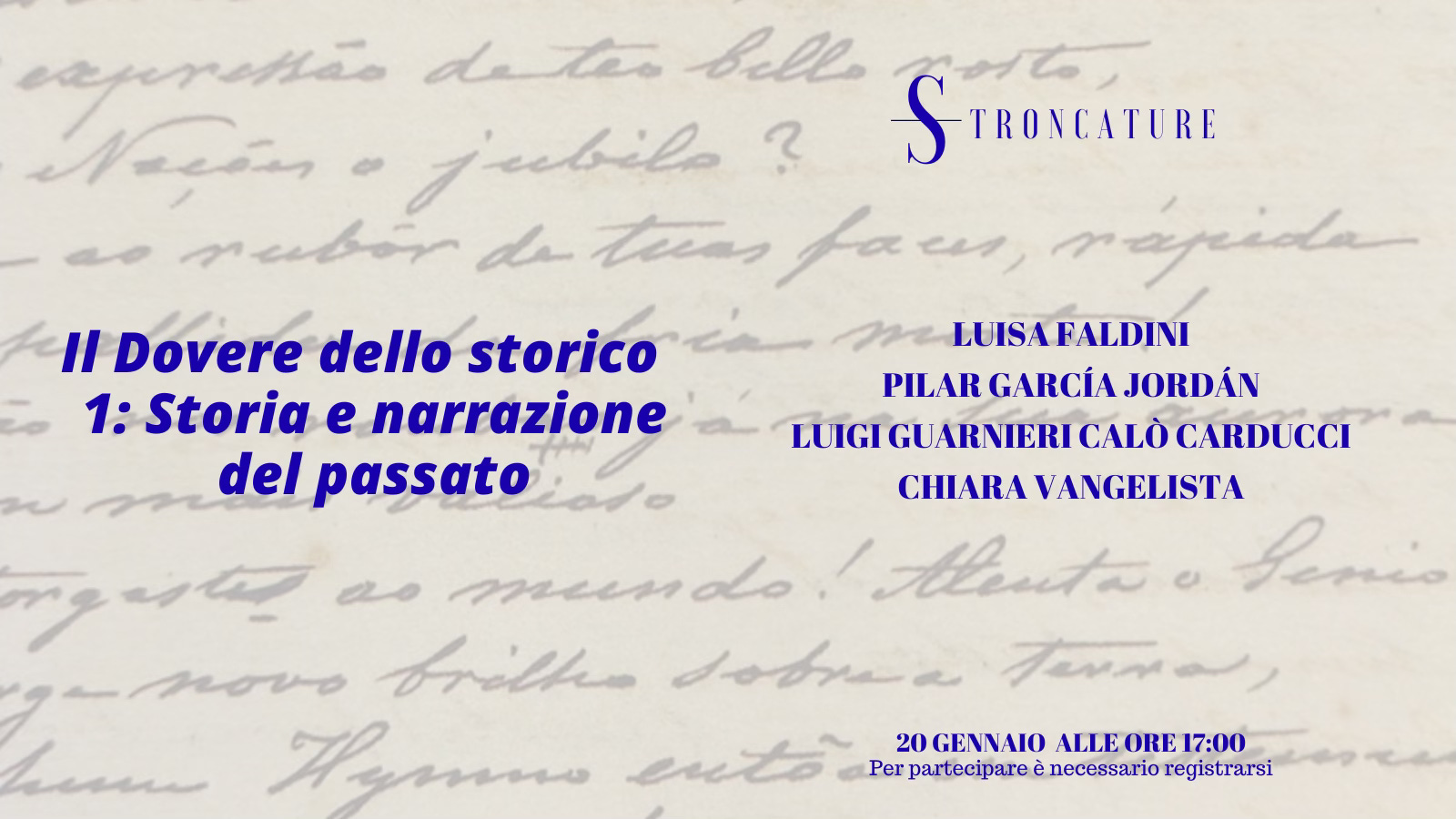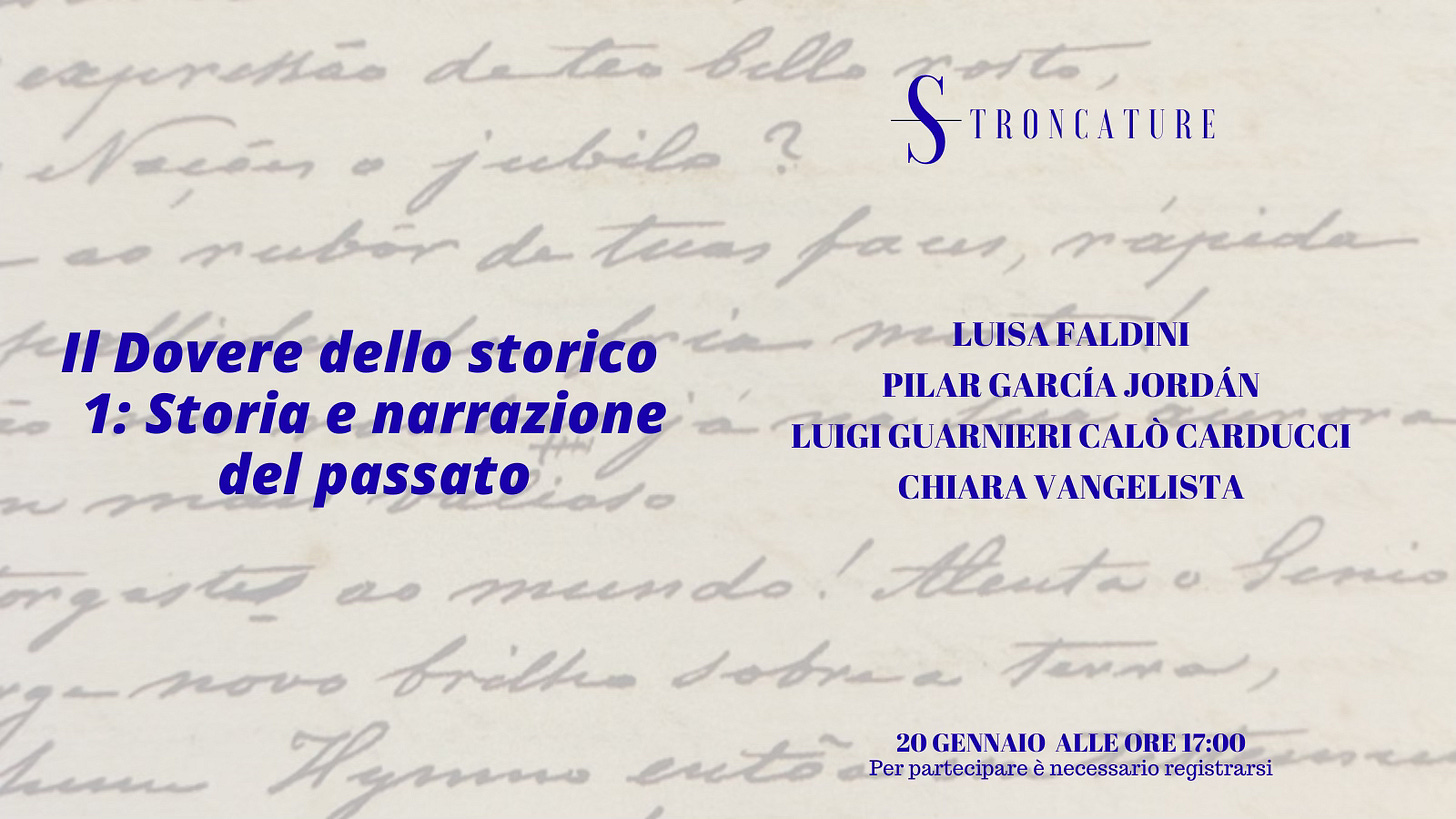 Il prossimo 20 gennaio, alle 17:00, Stroncature ospita una nuova puntata della rubrica “Tertulias” diretta da Chiara Vangelista. L’occasione della puntata sarà il primo appuntamento del nuovo filone di incontri “Il dovere dello storico”. Il primo incontro avrà il titolo Storia e narrazione del passato.