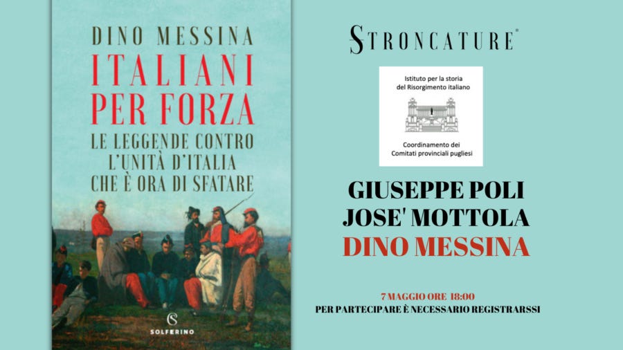 "Italiani per forza" di Dino MessinaRecensioni & Presentazioniapr 23, 2021∙ A pagamentoCondividiIl prossimo 7 maggio 2021, ore 18:00 Stroncature ospita la presentazione, organizzata dal Coordinamento dei Comitati pugliesi ISRI, del volume “Italiani per forza. E leggende contro l’unità d’Italia …Questo post è per abbonati a pagamento.IscrivitiGià abbonato a pagamento? AccediPrecedenteAvanti
