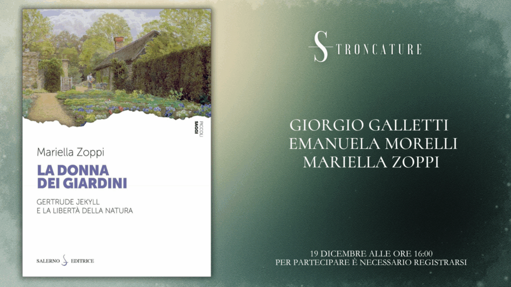 Il prossimo 19 dicembre alle 16:00, Stroncature ospiterà la presentazione del libro “La donna dei giardini. Gertrude Jekyll e la libertà della natura” di Mariella Zoppi (Salerno Editrice, 2025).