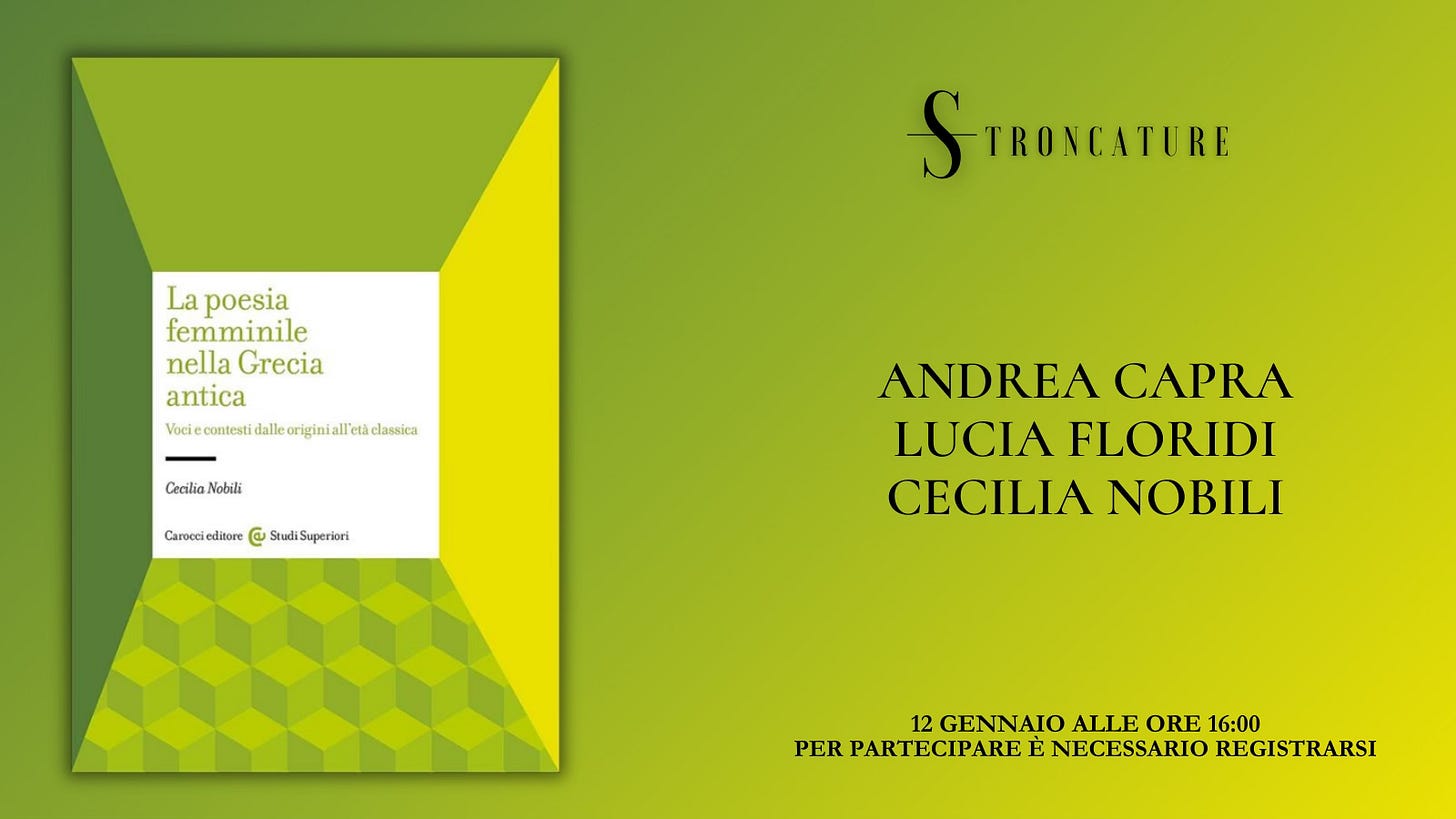 Il prossimo 12 gennaio alle 16:00, Stroncature ospiterà la presentazione del libro “La poesia femminile nella Grecia antica” di Cecili Nobili (Carocci editore, 2025).