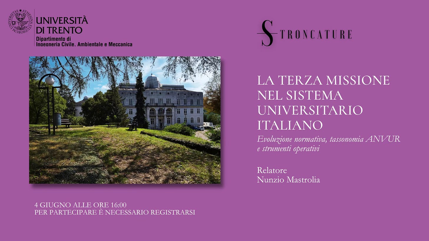Il prossimo 4 giugno alle 16:00, il Diparimento di Ingegneria Civile, Ambientale e Meccanica dell'Università degli Studi di Trento organizza, assieme a Stroncature, una lezione dal titolo “La Terza Missione nel sistema universitario italiano: evoluzione normativa, tassonomia ANVUR e strumenti operativi” relatore Nunzio Mastrolia.