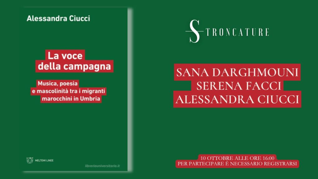 Il prossimo 10 ottobre alle 16:00, Stroncature ospiterà la presentazione del libro “La voce della campagna. Musica, poesia e mascolinità tra i migranti marocchini in Umbria” di Alessandra Ciucci (Meltemi, 2025).