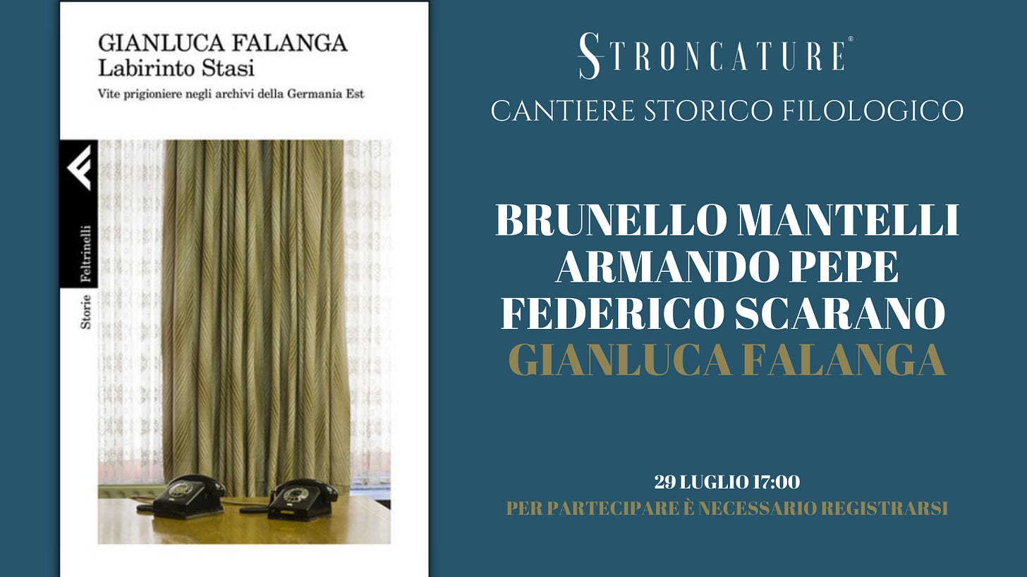 "Labirinto Stasi" di Gianluca FalangaRecensioni & Presentazionigiu 23, 2021∙ A pagamentoCondividiIl prossimo 29 giugno alle ore 17:00, Stroncature ospita la presentazione del volume “Labirinto Stasi. Vite prigioniere negli archivi della Germania Est” di Gianluca Falanga (Feltrinelli, 2021). Con …Questo post è per abbonati a pagamento.IscrivitiGià abbonato a pagamento? AccediPrecedenteAvanti