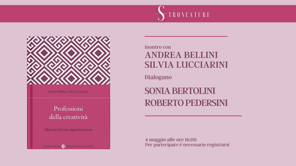 Il prossimo 4 maggio alle 16:00, Stroncature ospiterà la presentazione del libro “Professioni della creatività” di Andrea Bellini e Silvia Lucciarini (Carocci, 2026).