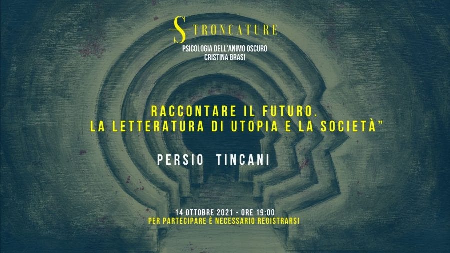"Raccontare il futuro. La letteratura utopica e la società" con Persio TincaniPsicologia dell'animo oscuroott 13, 2021∙ A pagamentoCondividiIl prossimo 14 ottobre ore 19,00, Stroncature ospita un nuovo appuntamento della serie ”psicologia dell’animo oscuro” diretto da Cristina Brasi dal titolo “Raccontare il futuro. La letteratura di Uto…Questo post è per abbonati a pagamento.IscrivitiGià abbonato a pagamento? AccediPrecedenteAvanti
