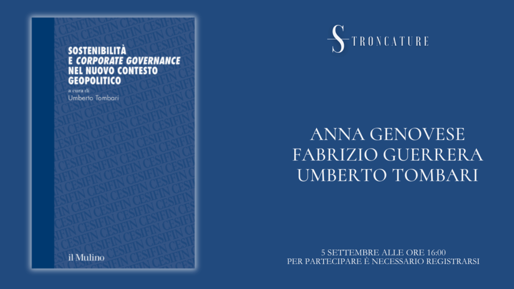 Il prossimo 5 settembre alle 16:00, Stroncature ospiterà la presentazione del libro "Sostenibilità e corporate governance nel nuovo contesto geopolitico" di Umberto Tombari (il Mulino, 2025).