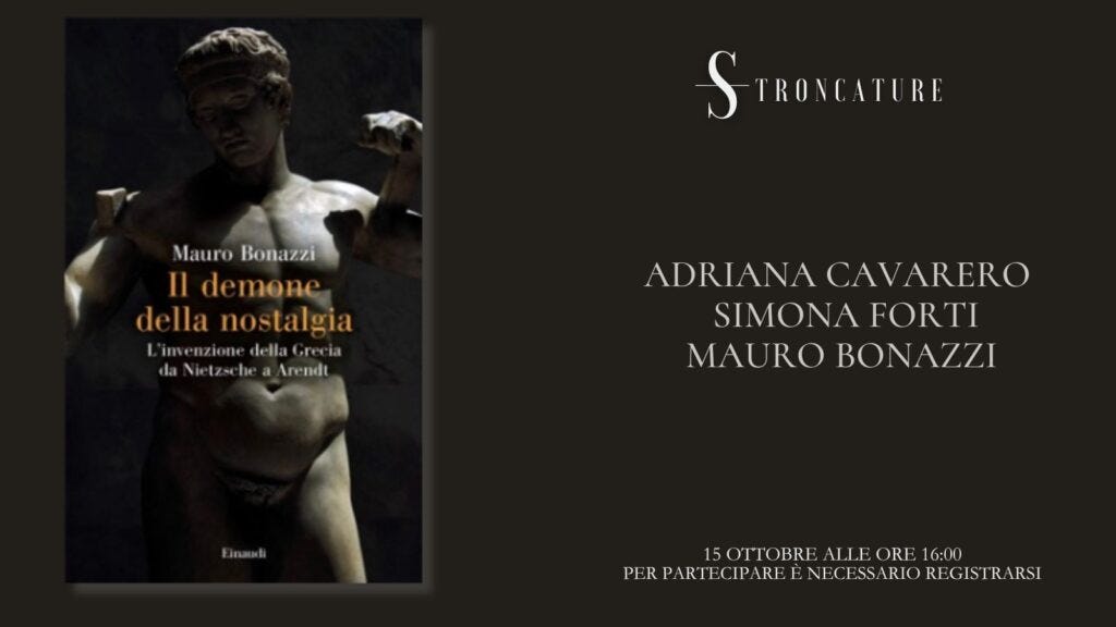 Il prossimo 15 ottobre alle 16:00, Stroncature ospiterà la presentazione del libro “Il demone della nostalgia” di Mauro Bonazzi (Einaudi, 2025). Il saggio di Mauro Bonazzi ricostruisce una delle grandi battaglie culturali dell’Europa tra Otto e Novecento: il confronto con l’eredità della Grecia antica. In un’epoca segnata da inquietudine e trasformazioni radicali, filosofi, filologi e intellettuali guardano alla Grecia come a una patria perduta, origine simbolica da cui sentirsi esuli ma a cui tornare per interrogarsi su chi siamo. Il libro esplora il ruolo del passato nella definizione dell’identità europea e occidentale, sia individuale sia collettiva. Attraverso le letture, spesso contrastanti, di autori come Nietzsche, Heidegger, Adorno, Popper e Arendt, Bonazzi mostra come la Grecia sia stata costantemente reinventata per rispondere alle crisi della modernità. Ne emerge un’idea di passato tutt’altro che pacificata: un terreno di scontro da cui continua a dipendere la forma del nostro futuro. Con l’autore dialogheranno: la prof.ssa Adriana Cavarero e la prof.ssa Simona Forti. Modera l’incontro Riccardo Pennisi. Per partecipare è necessario registrarsi.