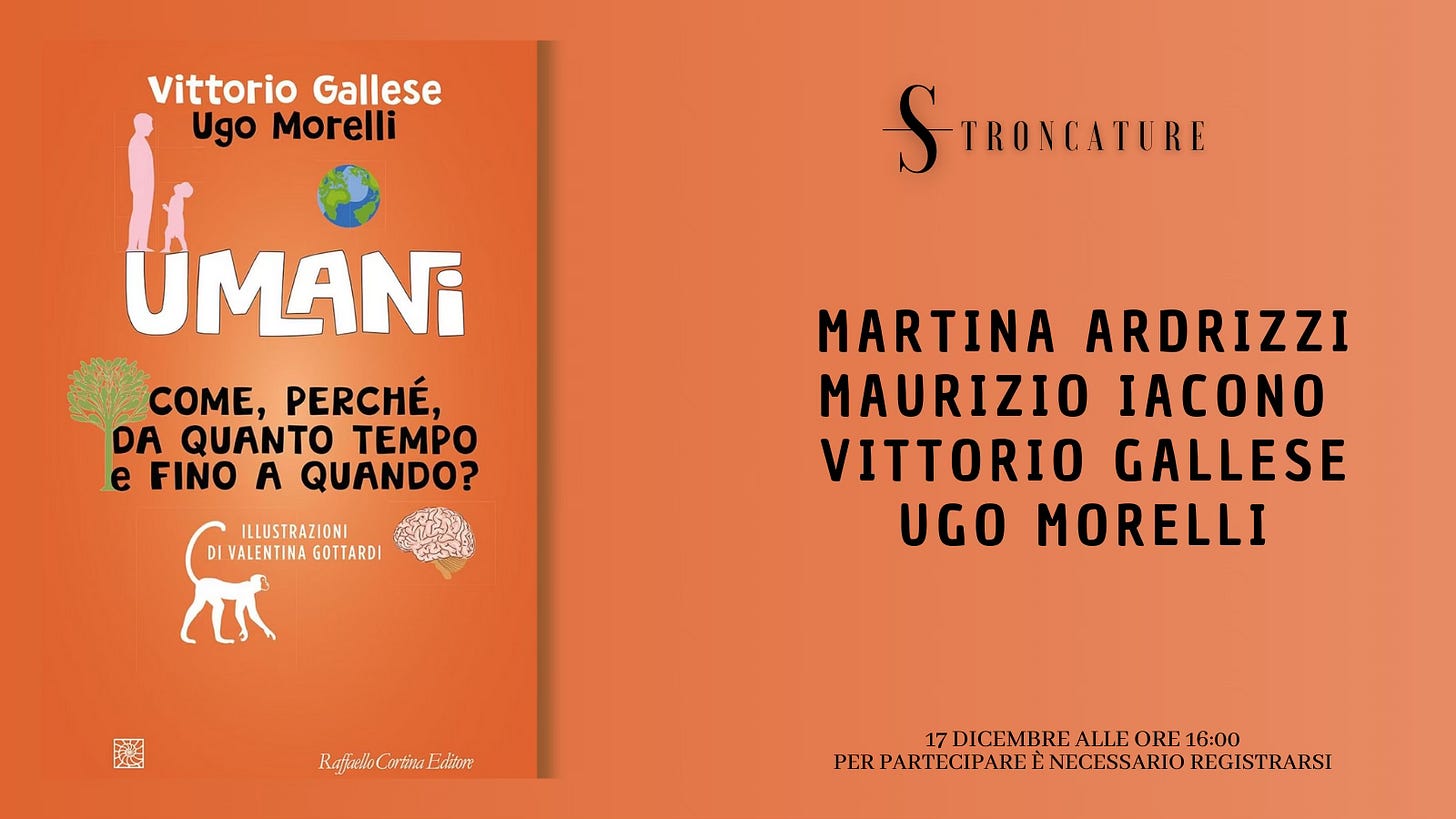 Il prossimo 17 dicembre alle 16:00, Stroncature ospiterà la presentazione del libro “Umani. Come, perché, da quanto tempo e fino a quando?” di Ugo Morelli, Vittorio Gallese (Raffaello Cortina Editore, 2025). Che cosa significa essere umani? Perché ci innamoriamo, ci arrabbiamo, proviamo solitudine o paura del futuro? E quanto contano gli altri nel modo in cui viviamo e pensiamo? Questo libro nasce per affrontare insieme ai più giovani le grandi domande dell’esistenza, non con risposte preconfezionate, ma come un invito alla scoperta e alla consapevolezza. Non è un manuale né un testo scolastico: è un percorso per conoscersi meglio, per abitare con più lucidità e gentilezza il mondo e le relazioni. Attraverso il dialogo con le scienze della vita e con un linguaggio vicino ma mai semplificato, il volume esplora capitolo dopo capitolo la natura sociale e relazionale dell’essere umano, mostrando come siamo “wired to be social”, condividui il cui corpo ed emozioni costituiscono la base della conoscenza di sé e dell’altro. Essere umani significa anche riconoscersi parte di una rete più ampia, quella della vita sul pianeta: da questa consapevolezza nasce la possibilità di assumersi la responsabilità del proprio stare al mondo e contribuire con creatività e bellezza alla costruzione di un futuro comune. Con gli autori dialogheranno la prof.ssa Martina Ardrizzi e il Prof. Maurizio Iacono. Modera l’incontro Riccardo Pennisi. Per partecipare è necessario registrarsi.
