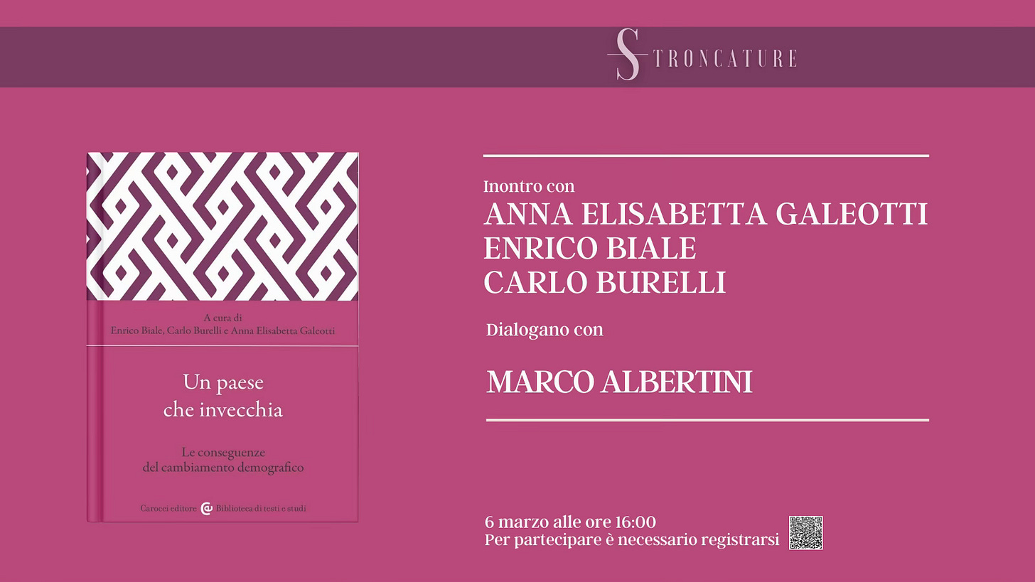 Il prossimo 6 marzo alle 16:00, Stroncature ospiterà la presentazione del libro “Un paese che invecchia” a cura di Enrico Biale, Carlo Burelli, Anna Elisabetta Galeotti (Carocci, 2026).